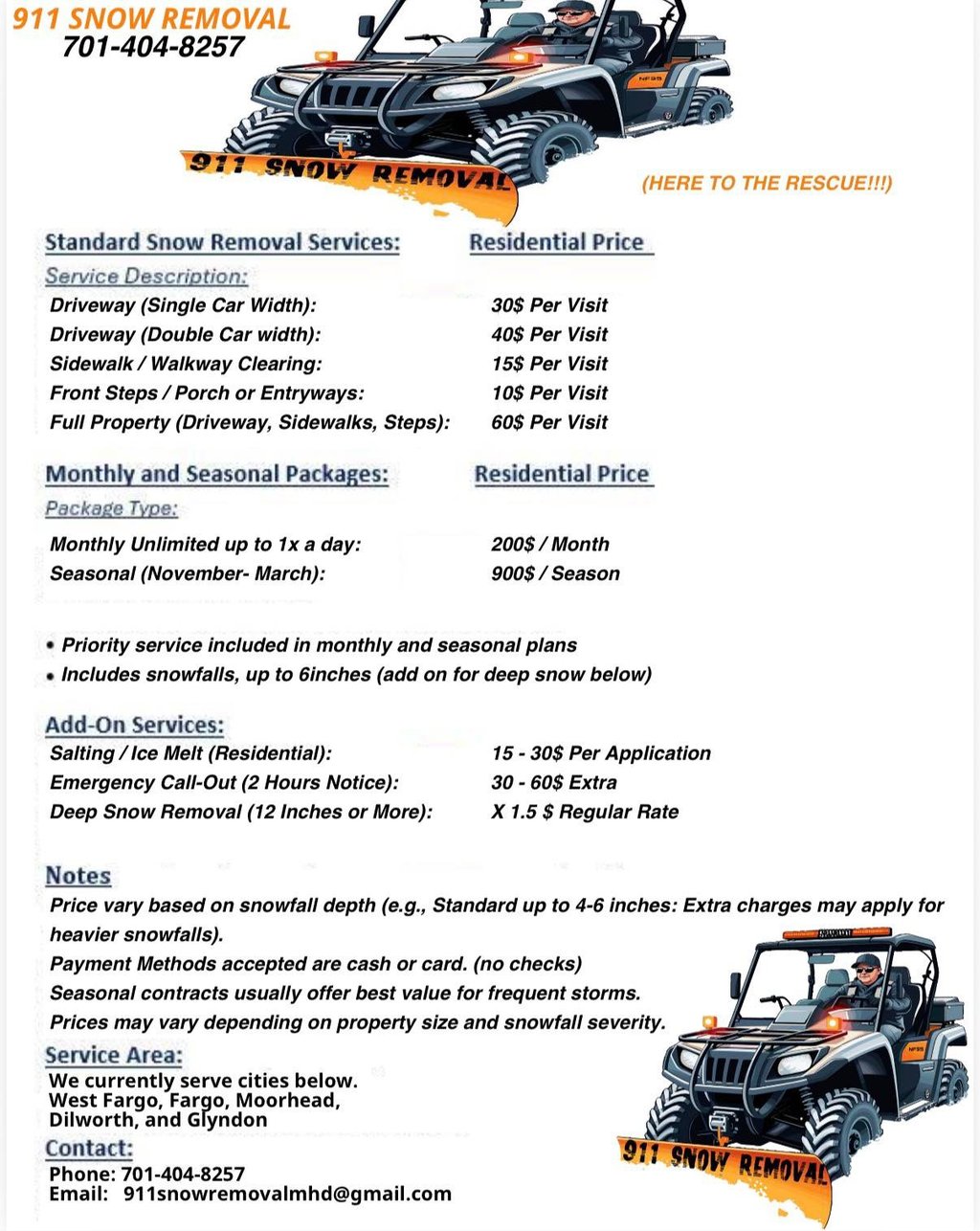 You can reach us at 701-404-8257 for inquiries and service requests. OR Email us at 911snowremovalmhd@gmail.com